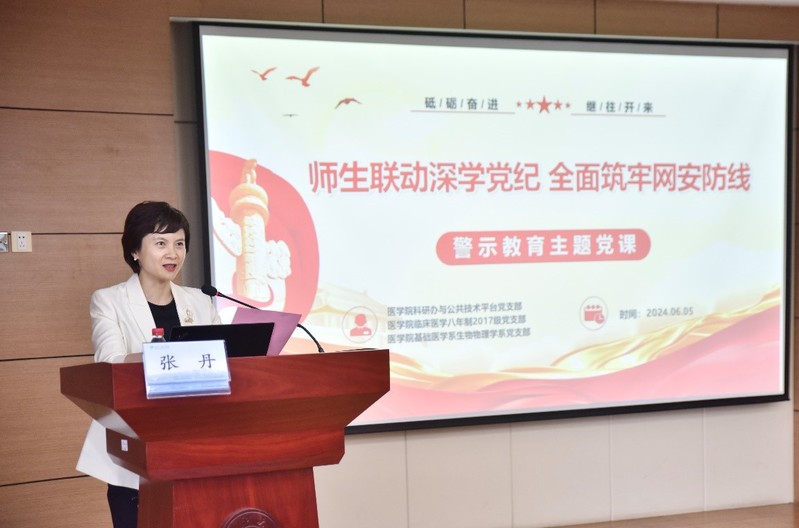 为深入学习领悟习近平总书记关于党纪学习教育的重要讲话和重要指示精神,进一步增强党员的政治定力、纪律定力和道德定力,全面提升师生网络安全意识和风险防范意识,6月5日,医学院科研办与公共技术平台党支部携手临床医学八年制2017级党支部、基础医学系生物物理学系党支部以及青年人才代表、学生寝室代表举行“师生联动深学党纪 全面筑牢网安防线”警示教育主题党课,以全面提升师生网络安全意识和风险防范意识。医学院副院长、科研办与公共技术平台党支部书记张丹主持会议。