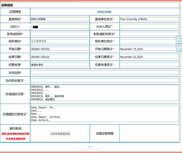 填写证明所需字段信息(系统将根据任务批件自动完成读取部分信息),点击生成派遣证明按钮后可预览。TIP:如信息有误,可重新编辑字段并再次生成。