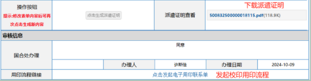 信息确认无误后,点击提交,待国合处审核通过后,可下载带有防伪二维码的派遣证明并在流程内点击“发起电子用印联系单”直接跳转至“Z0001:电子用印联系单申请”。