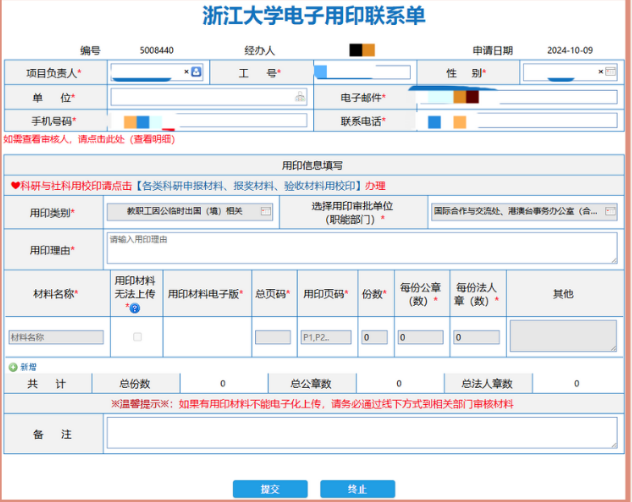 填写用印理由后点击提交,即可下载用印联系单(此步骤无审核环节),TIP:系统将自动蒂入用印材料并生成用印页码等信息,无需手动填写。